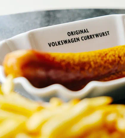 Original VW Currywurst wahlweise mit Pommes Frites oder Kartoffelsalat