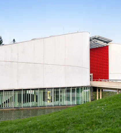 Über eine Holzbrücke führt der Weg mitten hinein in den SEAT Pavillon, der sich die Geographie der iberischen Halbinsel zum Vorbild nimmt. Die an der Fassade angebrachten 349 Außenspiegel bilden einen farbenfrohen Kontrast zum Weiß des Markenpavillons.