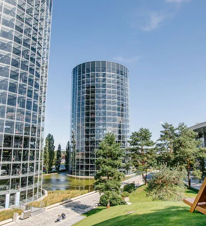 A landmark visible beyond Autostadt, the Car Towers store up to eight hundred new cars. The fully automated high racks move an average of five hundred cars to be delivered and picked up every day. The two cylinders each soar forty-eight metres into the sky next to the Customer Centre towards the eastern perimeter of Autostadt. The fully glazed hot-dip galvanised steel structure leaves space for a glimpse into each tower’s interior.
