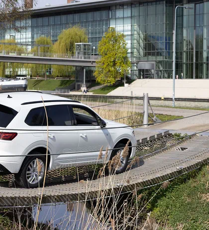 Wie wirkt ein Allradantrieb beim Hinauffahren einer Treppe? Auf dem über einen Kilometer langen Geländeparcours erleben Sie die Offroad-Qualitäten des Volkswagen Touareg. Fahraufgaben wie ein tiefer Wassergraben, Treppenstufen, eine Wippe oder ein Hügel mit 60-prozentiger Steigung gilt es während einer ca. 60-minütigen Tour zu meistern.