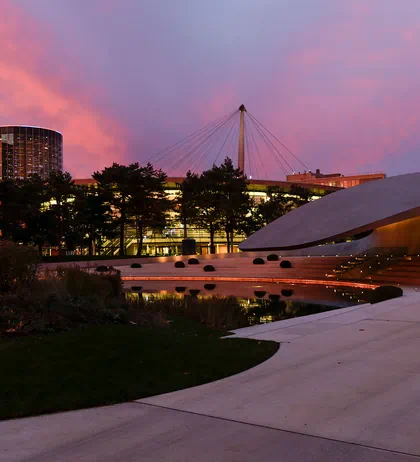In einer einzigartigen Kombination aus Funktionalität und Design erleben Sie im Porsche Pavillon die Philosophie und Werte der traditionsreichen Sportwagenmarke. Von außen erkennen Sie den Pavillon an seiner geschwungenen Dachkonstruktion, die weit über die Wasserfläche der Lagune ragt. Sowohl die Oberfläche aus Edelstahl als auch die dynamische und elegante Linienführung erinnern unverkennbar an Automobile aus dem Hause Porsche.