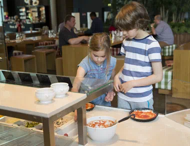 Die Lieblingspizza in Ruhe genießen und dabei den Nachwuchs im Blick haben? Auch das geht im AMano. Bis zum Spielbereich Mobiversum sind es nämlich nur wenige Schritte. Klar gibt es Stellplätze für Kinderwagen. Und eine vielfältige italienische Speise- und Getränkekarte, darauf Salate, Antipasti, hausgemachte Pasta, Desserts oder Eis aus unserer Manufaktur. Hausgemacht ist auch unsere erfrischende Limonade, die wenig Zucker enthält. Entspannen Sie nach einem trubeligen Tag bei köstlichen Spritzvariationen, einem Aperitif oder einem Glas Wein.